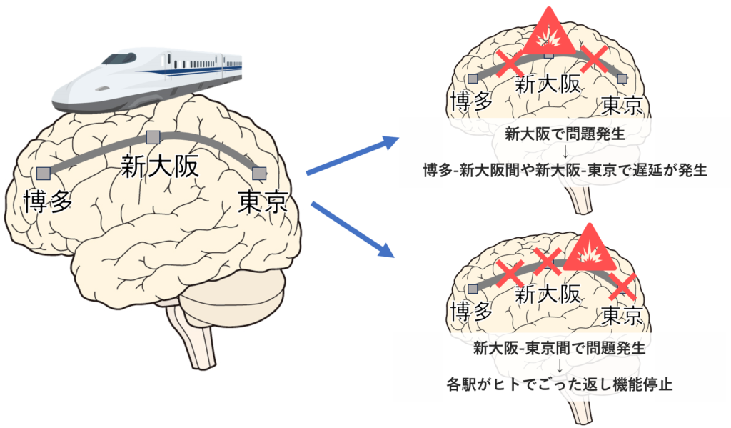 脳の機能は、その場所とすでに連絡している経路が決まっているねん。イメージとしては、新幹線の駅と線路の関係やな~。